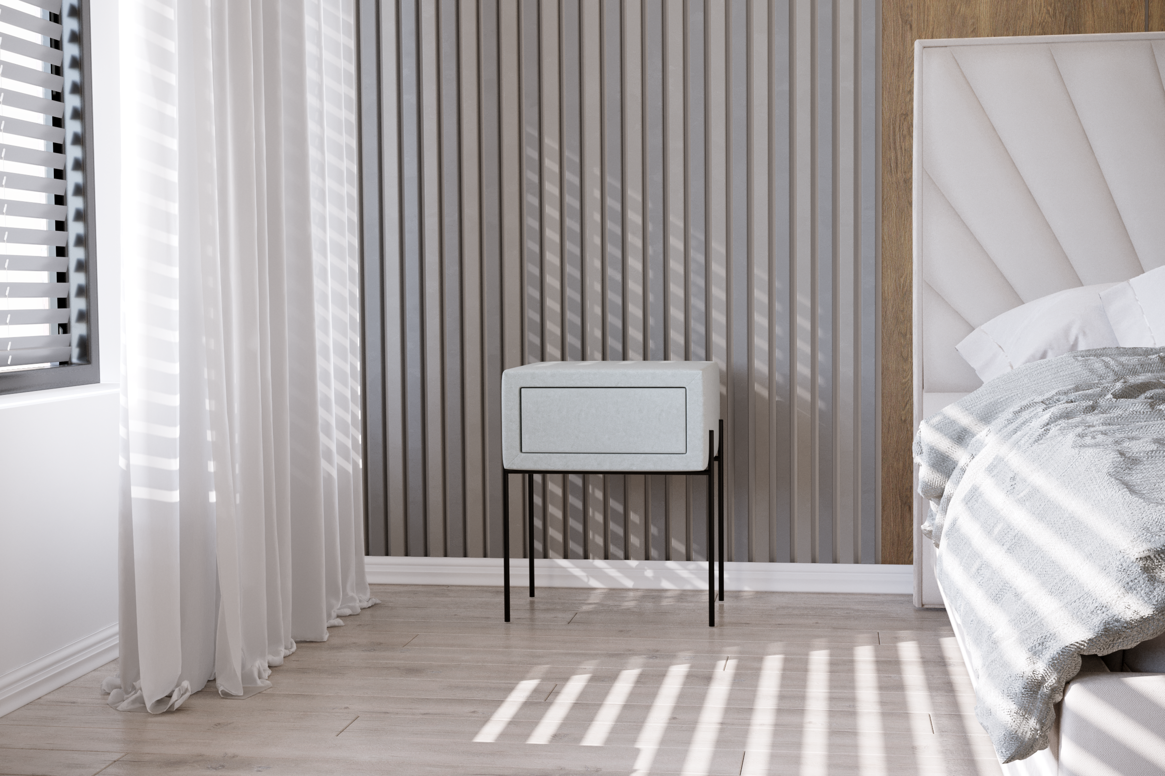 Jeśli szukasz nowoczesnych mebli o wyglądzie pasującym zwłaszcza do minimalistycznej sypialni to koniecznie zwróć uwagę na tę właśnie szafkę tapicerowaną. Ten kompaktowy i niepozorny model zachwyca prostotą formy i doskonałym wykonaniem. Szafka jest dostępna w wielu tkaninach i kolorach, dzięki czemu mamy dużą niezależność podczas projektowania sypialni. Tapicerowane meble to propozycja dla osób, które lubią styl i oryginalność. Uwagę zwracają zwłaszcza smukłe metalowe nóżki. Mebel widoczny na zdjęciu ma całkiem spory blat, wygodną i cichą szufladę bezuchwytową.