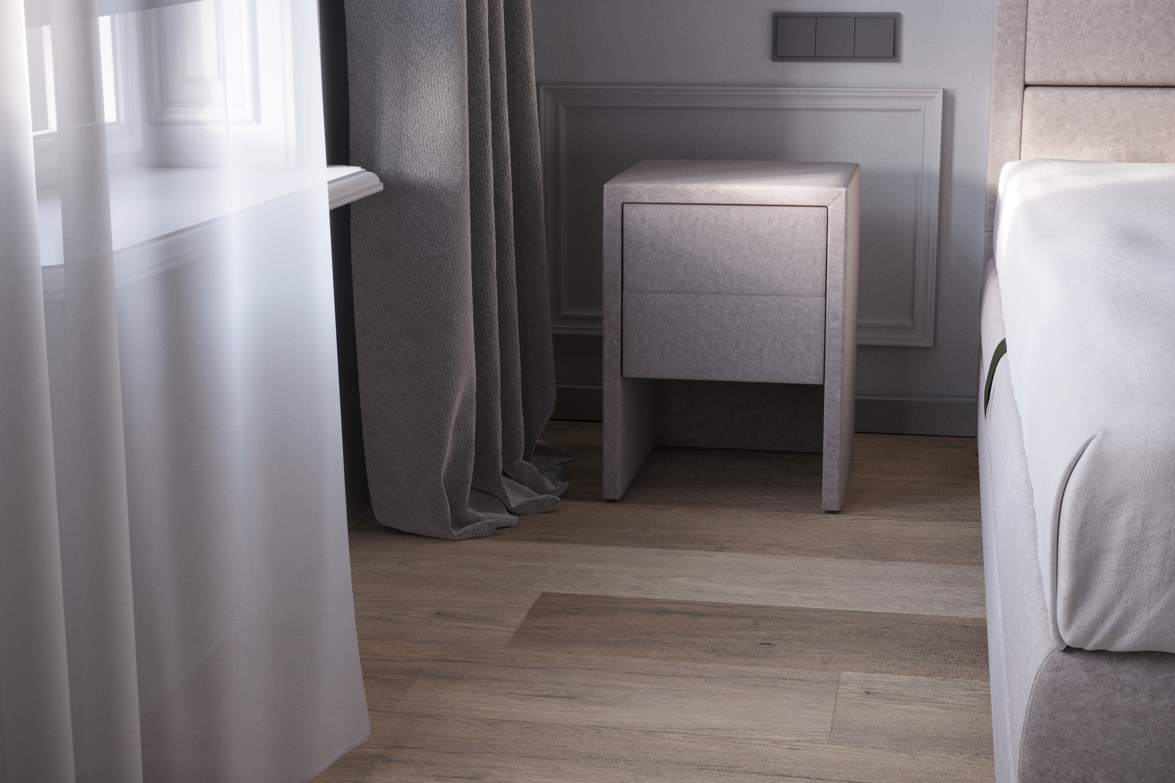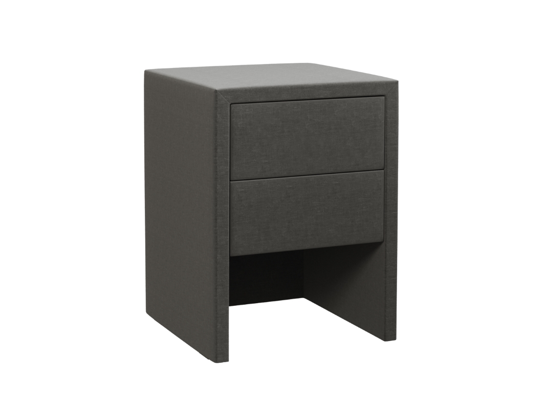 Szafka nocna widoczna na zdjęciu to nowoczesny mebel tapicerowany, który doskonale komponuje się w zestawie z tapicerowanym łóżkiem czy innymi meblami z obiciem materiałowym. Jest dostępna w wielu pięknych i ciekawych tkaninach, a jej kolor można dopasować indywidualnie do stylu sypialni. Szafka tapicerowana ma dwie pojemne i wygodne szuflady bezuchwytowe, co pomoże utrzymać porządek w sypialni. Mebel posiada prowadnice Blum.