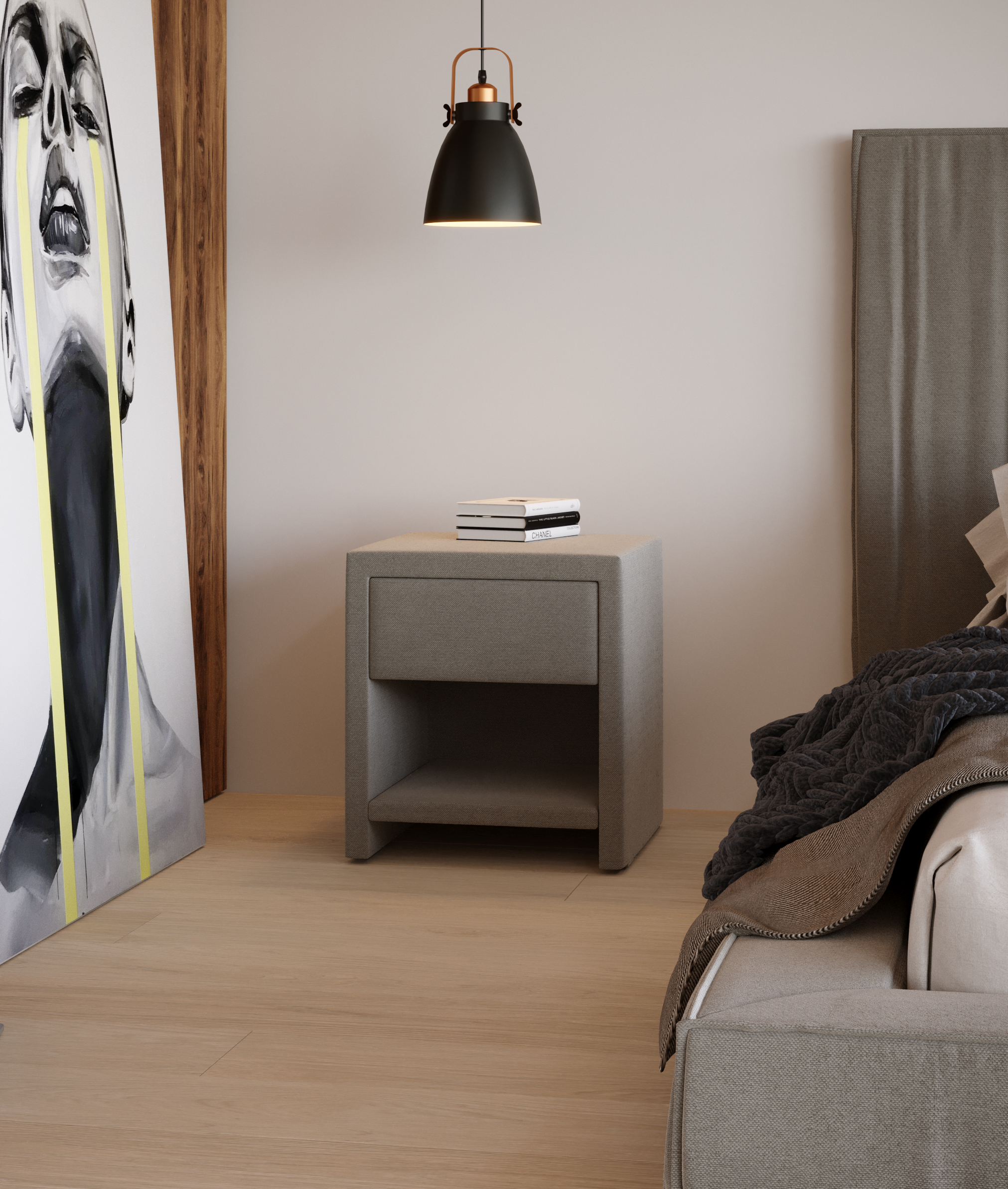 Szafka tapicerowana to wszechstronny mebel do sypialni. Ma piękny design i świetnie sprawdza się do przechowywania codziennych drobiazgów, które dobrze jest mieć pod ręką. Szafka ma bardzo przemyślaną konstrukcję, do dyspozycji jest powierzchnia blatu, pojemna zamykana szuflada oraz wszechstronna półka. Ten kompaktowy mebel ma ogromny potencjał, który może zostać wykorzystany do stworzenia pięknej sypialni. Mebel posiada prowadnice Blum. Szafka otapicerowana z 4 stron.