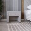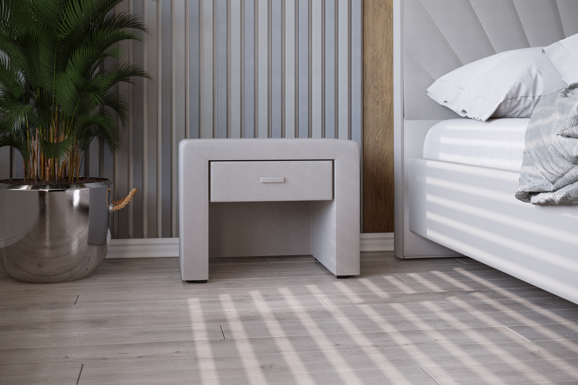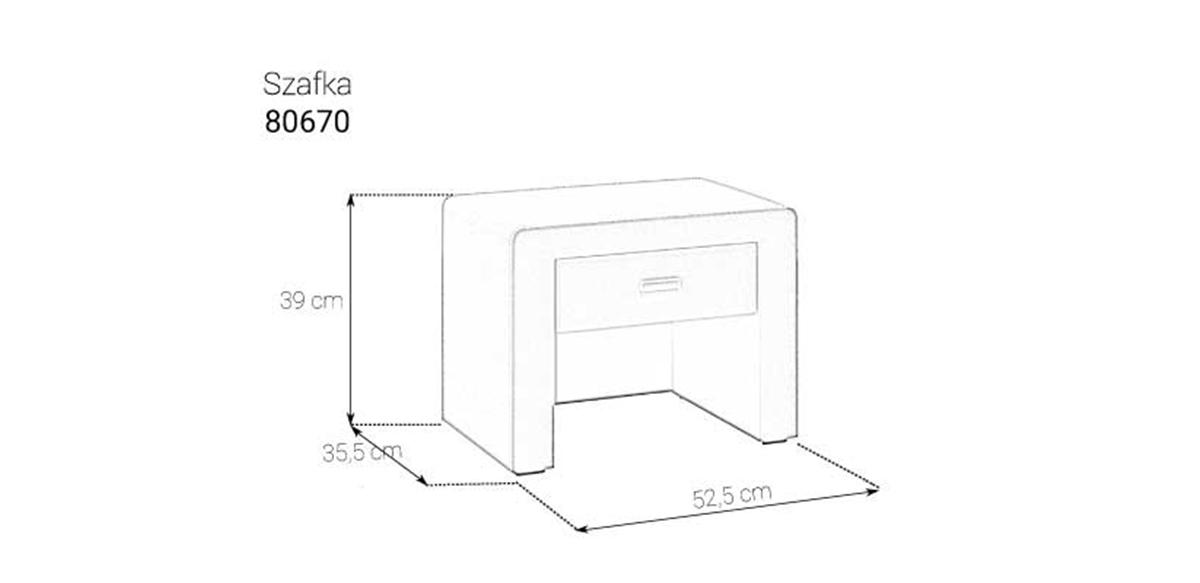 Szafka widoczna na zdjęciu to elegancki mebel tapicerowany z dużym blatem i gustowną szufladą. Do wyboru jest całe mnóstwo tkanin obiciowych oraz kolorów, dzięki czemu bez trudu można zaaranżować wygląd szafki i sypialni po swojemu. Do przechowywania służy całkiem pokaźny blat, na którym można postawić lampkę nocną, położyć telefon, szklankę wody czy ulubione czasopismo do poczytania wieczorem. Na bardziej intymne przedmioty sprawdzi się z kolei schowana w konstrukcji szuflada z wygodnym uchwytem.