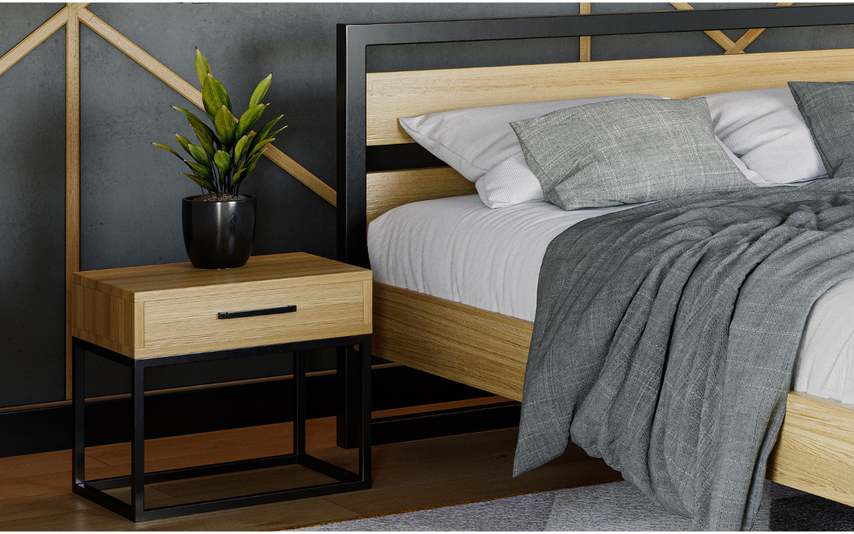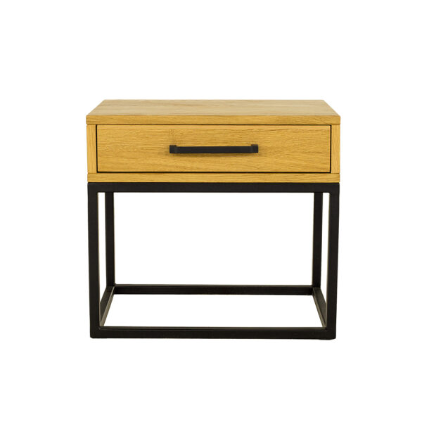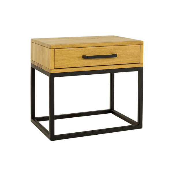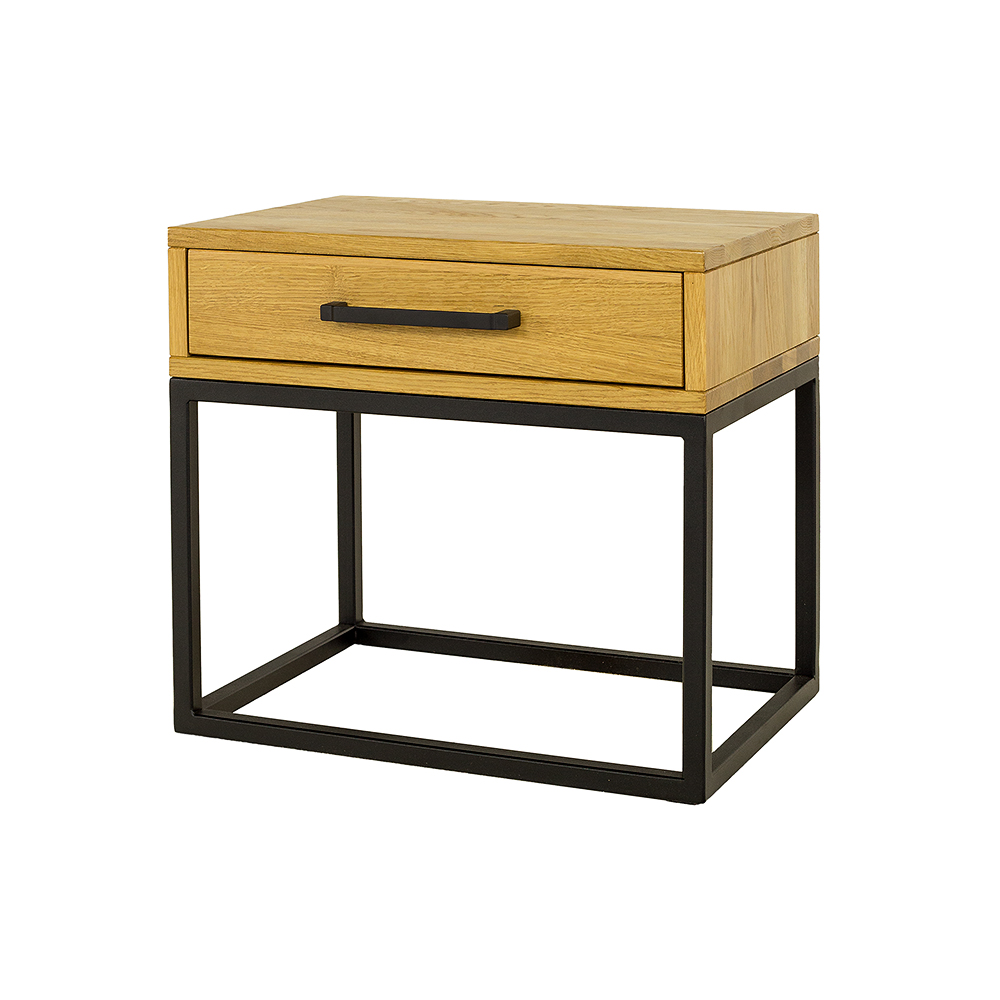 Szafka Nocna SN370 z kolekcji Metal to doskonałe połączenie nowoczesności i tradycji, stanie się ona ozdobą każdej sypialni wprowadzając do wnętrza industrialny charakter i wygodę użytkowania. Szafka łączy w sobie solidność czarnego metalu z naturalnym pięknem litego drewna dębowego, taki mariaż materiałów sprawia, że mebel jest nie tylko trwały, ale także unikatowy i niezwykle atrakcyjny. Przestronna szuflada zapewniają przestrzeń do przechowywania niezbędnych przedmiotów, takich jak książki, okulary czy inne akcesoria, które chcesz mieć pod ręką. Jej piękny dębowy front wyposażono w wygodny, ergonomiczny uchwyt, ułatwiający codzienne użytkowanie.