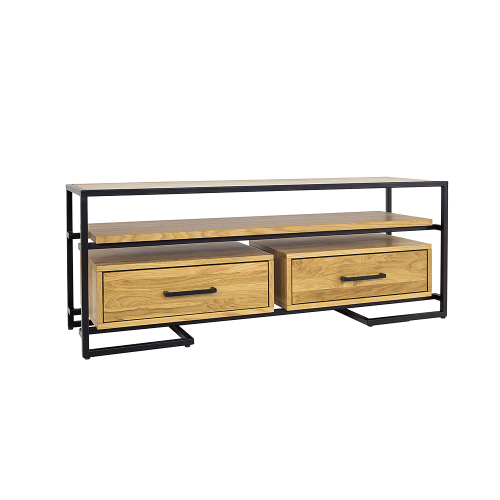 Dębowa szafka RV370 z kolekcji Metal to doskonałe połączenie nowoczesności i tradycji, stanie się ona ozdobą każdego salonu, sypialni czy gabinetu, wprowadzając do wnętrza industrialny charakter i wygodę użytkowania. Szafka łączy w sobie solidność czarnego metalu z naturalnym pięknem litego drewna dębowego, taki mariaż materiałów sprawia, że mebel jest nie tylko trwały, ale także unikatowy i niezwykle atrakcyjny. Otwarta półka na sprzęt rtv oraz dwie przestronne szuflady zapewniają przestrzeń do przechowywania niezbędnych przedmiotów. Ich piękne dębowe fronty wyposażone w wygodne, ergonomiczne uchwyty, ułatwiające codzienne użytkowanie.
