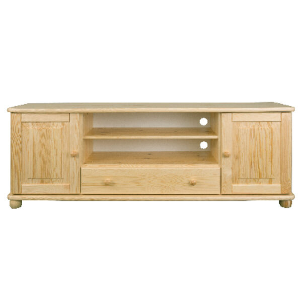 Sosnowa szafka RTV RV128 to idealne rozwiązanie dla osób ceniących sobie zarówno estetykę, jak i funkcjonalność. Dzięki swojej konstrukcji, szafka ta doskonale sprawdzi się w salonie lub sypialni, zapewniając miejsce na przechowywanie oraz wyeksponowanie sprzętu elektronicznego. Wykonana z wysokiej jakości drewna sosnowego, charakteryzuje się trwałością i estetyką, która łączy klasyczny design z nowoczesnymi trendami. Szafka wyposażona jest w dwie zamykane szafki, które zapewniają miejsce do przechowywania przedmiotów, które chcemy ukryć przed wzrokiem. Przestronna szuflada idealnie sprawdzi się na drobne akcesoria, takie jak kable, piloty czy dokumenty. Otwarte półki umożliwiają umieszczenie sprzętu RTV, dzięki ich konstrukcji, urządzenia mają zapewnioną odpowiednią wentylację. Fronty szafek są ozdobione wyraźnymi frezami, które dodają całemu meblowi elegancji i unikalnego charakteru. Szafka transportowana w paczkach do montażu.
