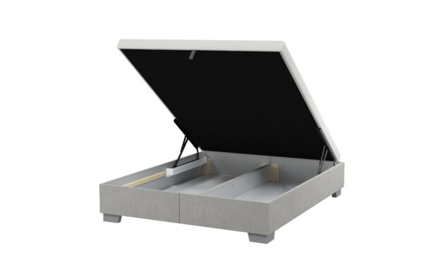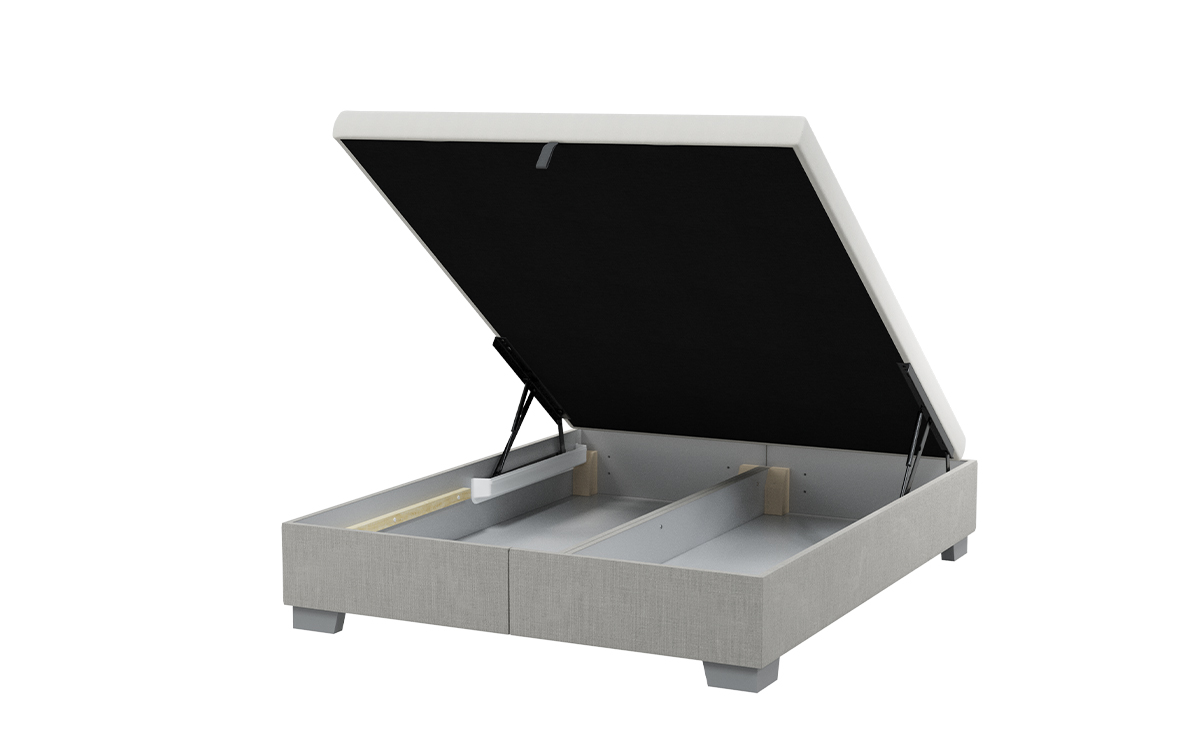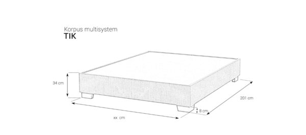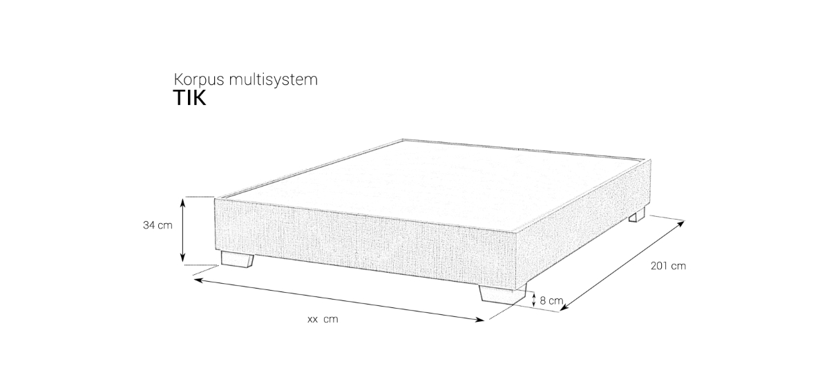 Korpus TIK ze stelażem drewnianym w materiale tapicerskim na siłownikach gazowych oraz z pojemnikiem na pościel. Stanowi samodzielne łóżko lub jest podstawą do zamontowania zagłówka, z którym stworzy unikatowy zestaw według projektu klienta. Występuje w bogatej ofercie tkanin obiciowych. Wymaga skompletowania z wybranym rodzajem materaca M&K foam. Możliwość zamówienia korpusu na ślizgaczach, pod nóżki lub wyposażenia go w efektowne nóżki z jednego z zestawów dedykowanych do tego korpusu. Za dodatkową opłatą istnieje możliwość zamówienia korpusu o nietypowej długości i szerokości. Od szerokości 120 cm korpus składa się z dwóch części.