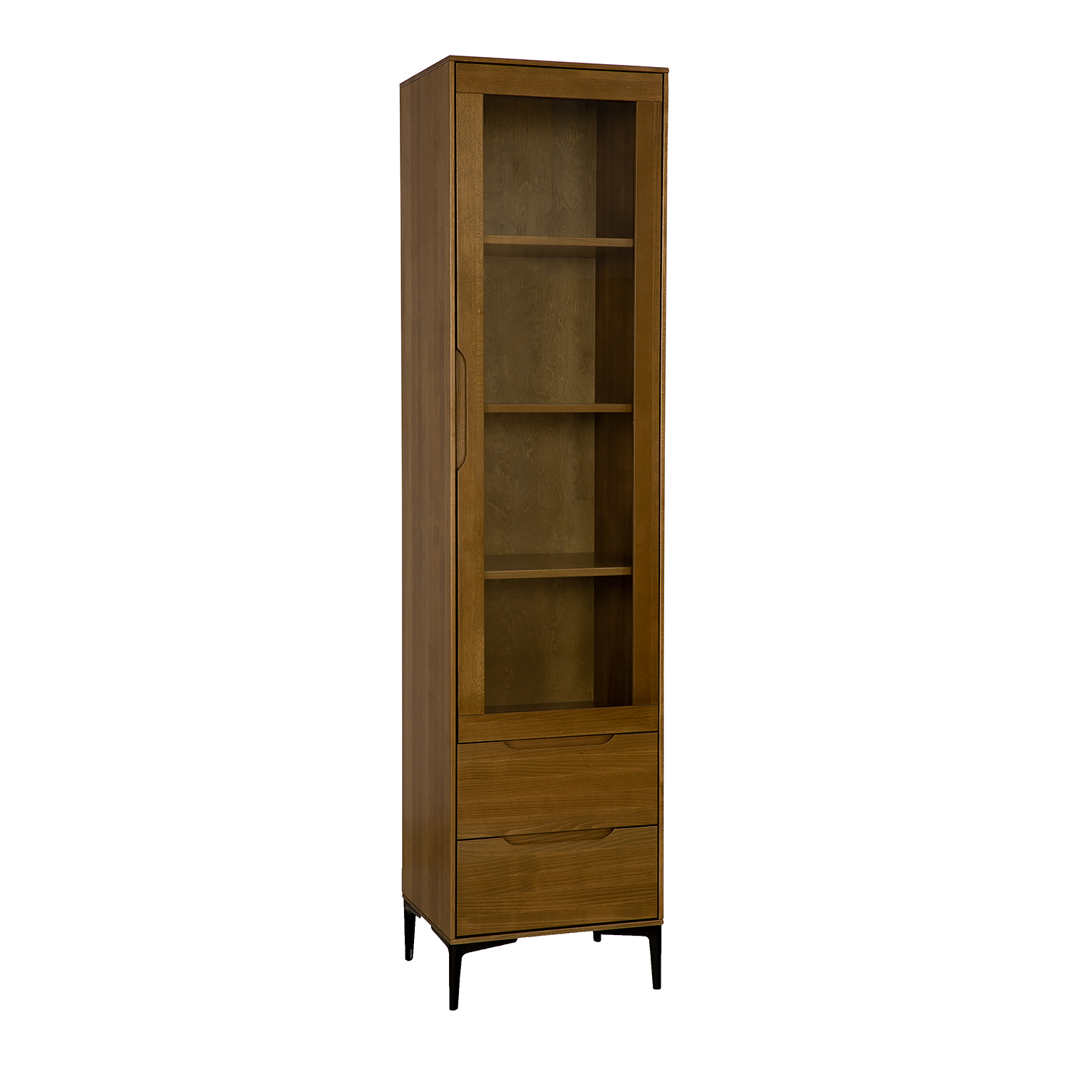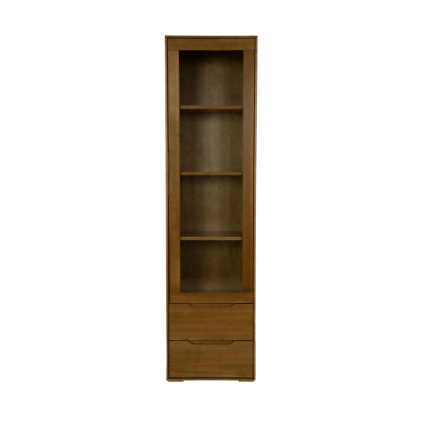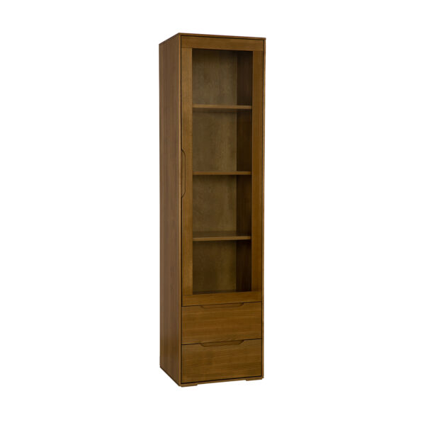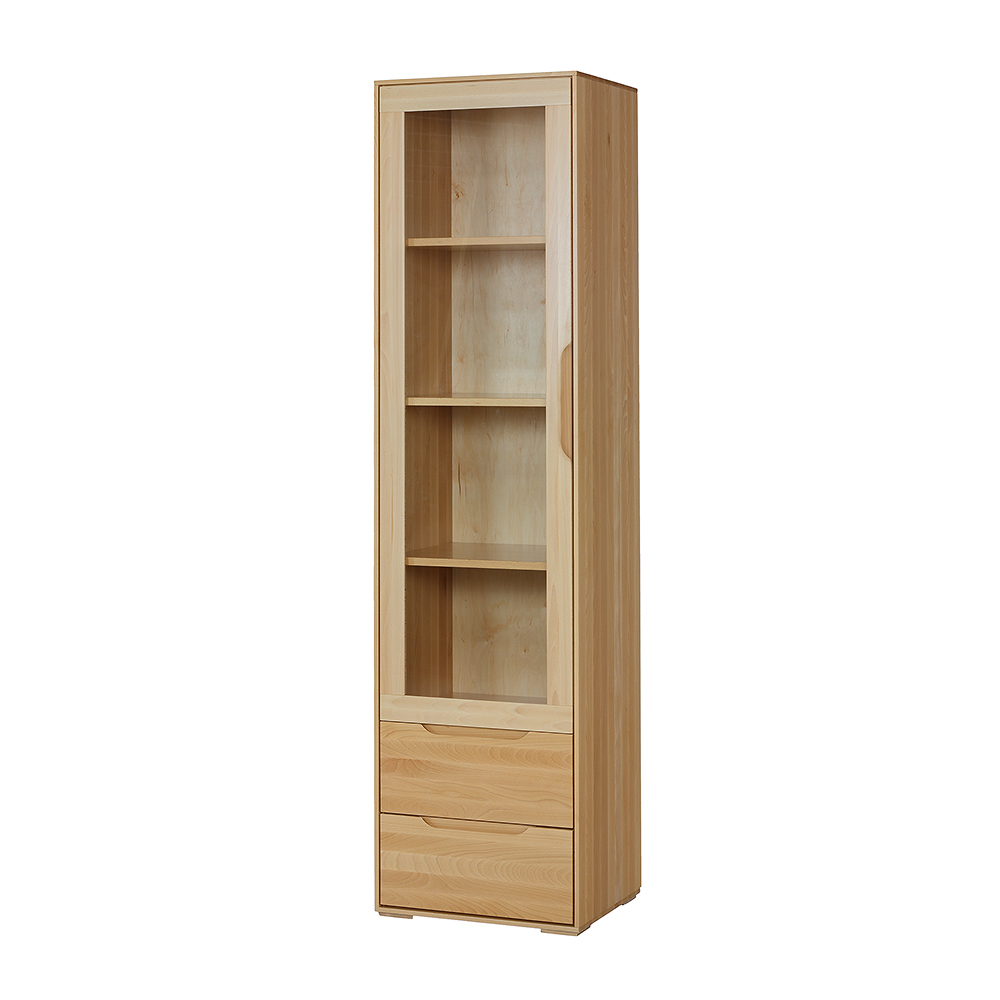 Bukowa witryna KW420 z kolekcji Modern to idealne połączenie funkcjonalności i nowoczesnego designu, które wzbogaci każdy gabinet, salon czy jadalnię. Wykonana z najwyższej jakości litego drewna bukowego, które zapewnia trwałość i elegancki, ponadczasowy wygląd. Wyposażona w dwie praktyczne szuflady oraz przeszkloną witrynę zapewniające zarówno przestrzeń do przechowywania, jak i miejsce do wyeksponowania ulubionych przedmiotów. Jej piękne bukowe fronty zdobią dekoracyjne podcięcia, które eliminują potrzebę uchwytów, nadając witrynie minimalistyczny i elegancki wygląd. W standardzie mebel osadzony został na niewielkich drewnianych nóżkach. Opcjonalnie istnieje możliwość wyposażenia witryny w metalowe nogi, które dodają jej lekkości i unikalnego charakteru, jednocześnie ułatwiając adaptację do różnych stylów wnętrz. Witryna transportowana w całości, nie wymaga montażu.