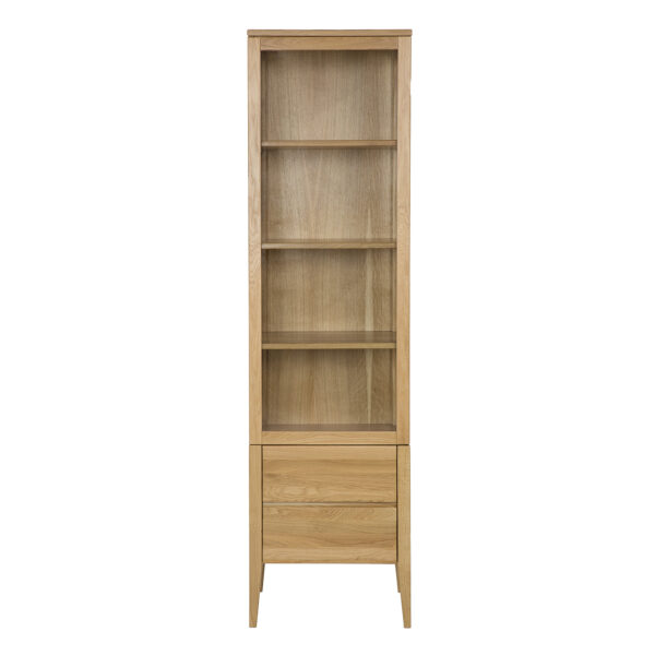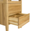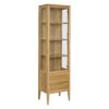 Dębowa witryna KW338 z kolekcji Retro to idealne połączenie funkcjonalności i estetyki, które wzbogaci każdy salon czy jadalnię. Wykonana z najwyższej jakości litego drewna dębowego, zapewnia nie tylko wytrzymałość, ale również elegancki wygląd, który pasuje do różnorodnych stylów wnętrzarskich. Wyposażona w dwie szuflady oraz przeszkloną z trzech stron witrynę zapewniające zarówno przestrzeń do przechowywania, jak i miejsce do wyeksponowania ulubionych przedmiotów. Ich piękne dębowe fronty zdobią subtelne, wycięte w drewnie uchwyty, tworzące nowoczesny system otwierania i zamykania. Wysokie, smukłe nogi nadają witrynie nowoczesnego wyglądu, a wnętrzu lekkości i przestronności, oferując praktyczne rozwiązania ułatwiające utrzymanie czystości.