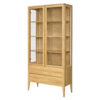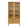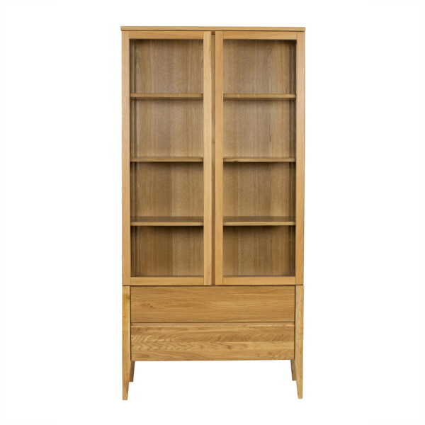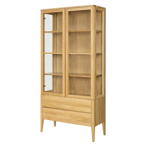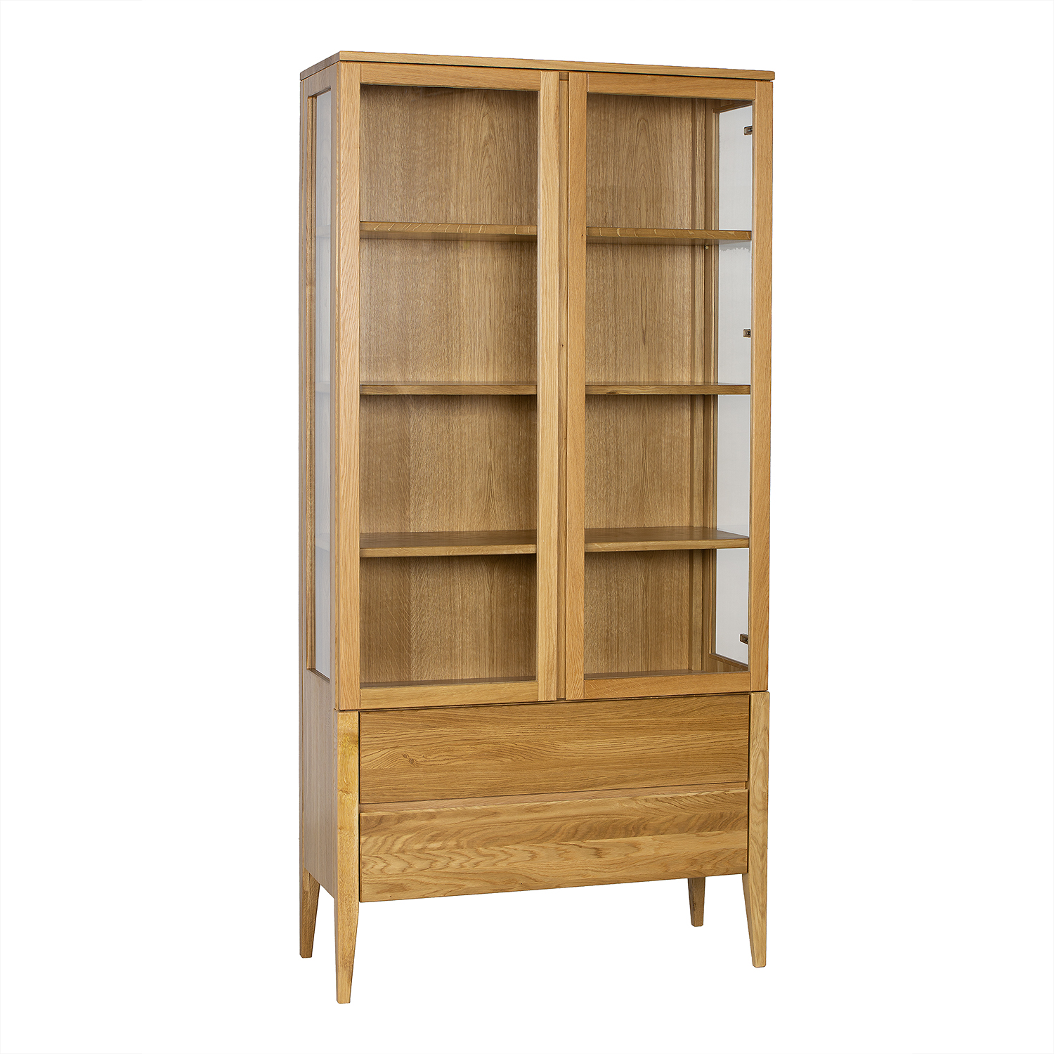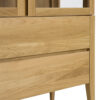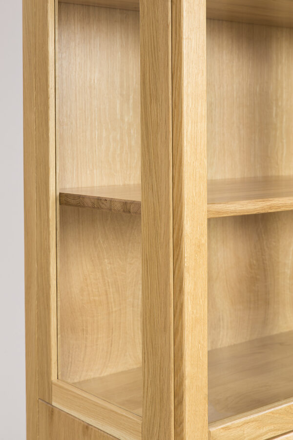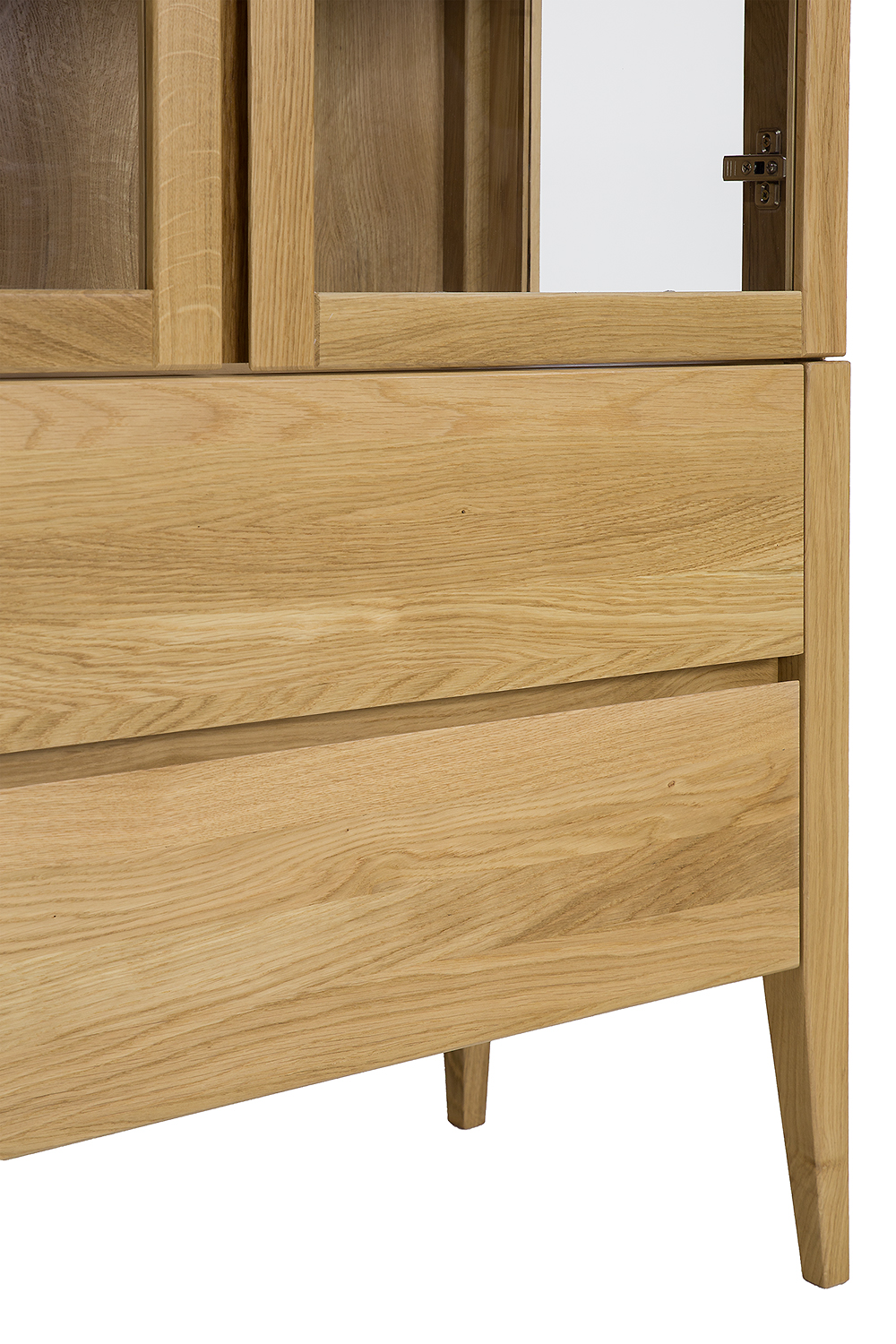 Dębowa witryna KW339 z kolekcji Retro to idealne połączenie funkcjonalności i estetyki, które wzbogaci każdy salon czy jadalnię. Wykonana z najwyższej jakości litego drewna dębowego, zapewnia nie tylko wytrzymałość, ale również elegancki wygląd, który pasuje do różnorodnych stylów wnętrzarskich. Wyposażona w dwie szuflady oraz przeszkloną z trzech stron witrynę zapewniające zarówno przestrzeń do przechowywania, jak i miejsce do wyeksponowania ulubionych przedmiotów. Ich piękne dębowe fronty zdobią subtelne, wycięte w drewnie uchwyty, tworzące nowoczesny system otwierania i zamykania. Wysokie, smukłe nogi nadają witrynie nowoczesnego wyglądu, a wnętrzu lekkości i przestronności, oferując praktyczne rozwiązania ułatwiające utrzymanie czystości.
