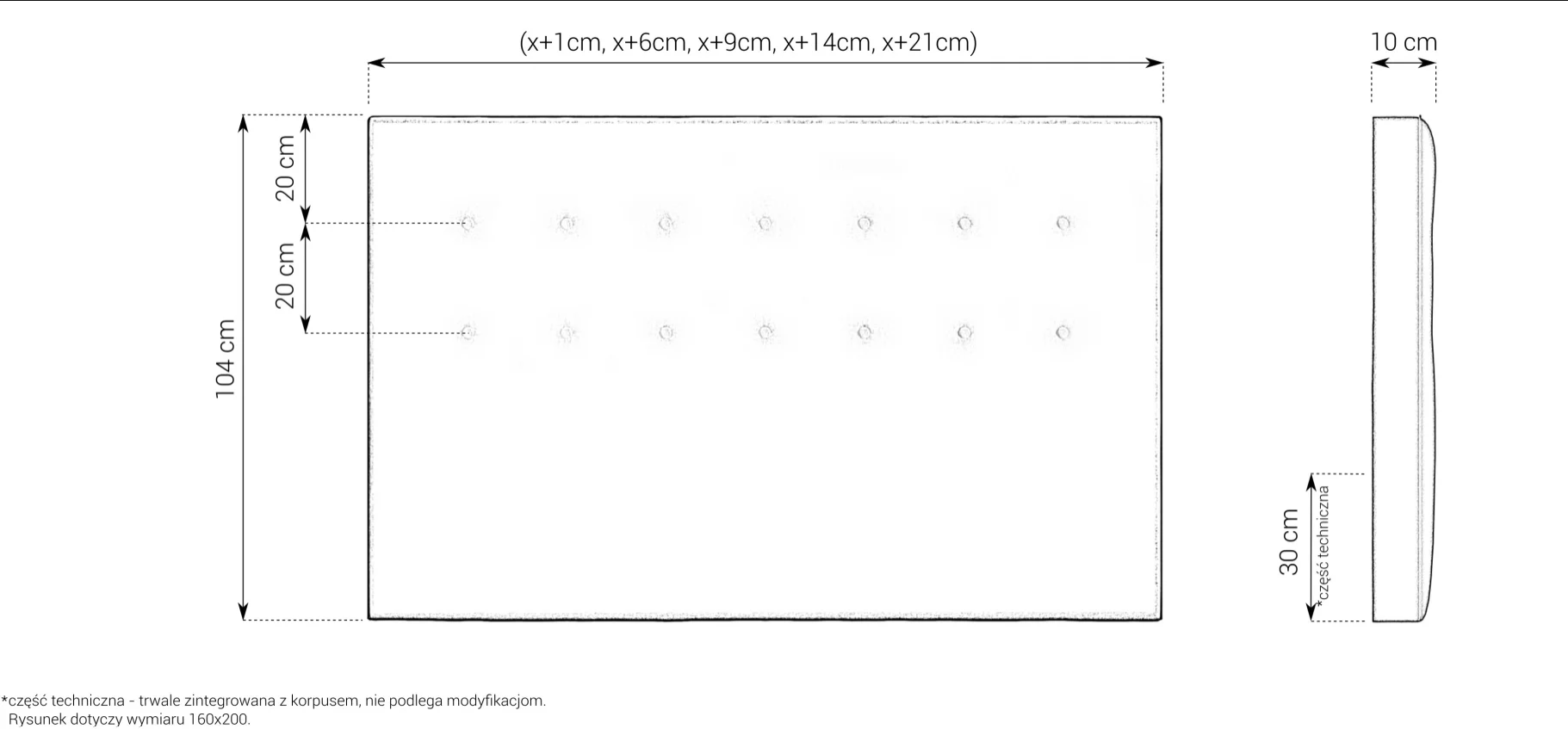Klasyczny i elegancki zagłówek współgra z każdym korpusem z serii Multisystem i otwiera nieograniczone możliwości stworzenia własnego projektu łóżka. Bogactwo tkanin pozwala zaaranżować sypialnię według indywidualnych upodobań i profesjonalnie połączyć wezgłowie z korpusem. Zagłówek ma wysokość około 104 cm i grubość około 10 cm. Jest ozdobiony dwoma równoległymi rzędami dekoracyjnych guzików, które można zastąpić kryształami Swarovski. Za dopłatą istnieje możliwość zamówienia zagłówka o wysokości lub szerokości innej niż standardowa oraz otapicerowania go w tylnej części