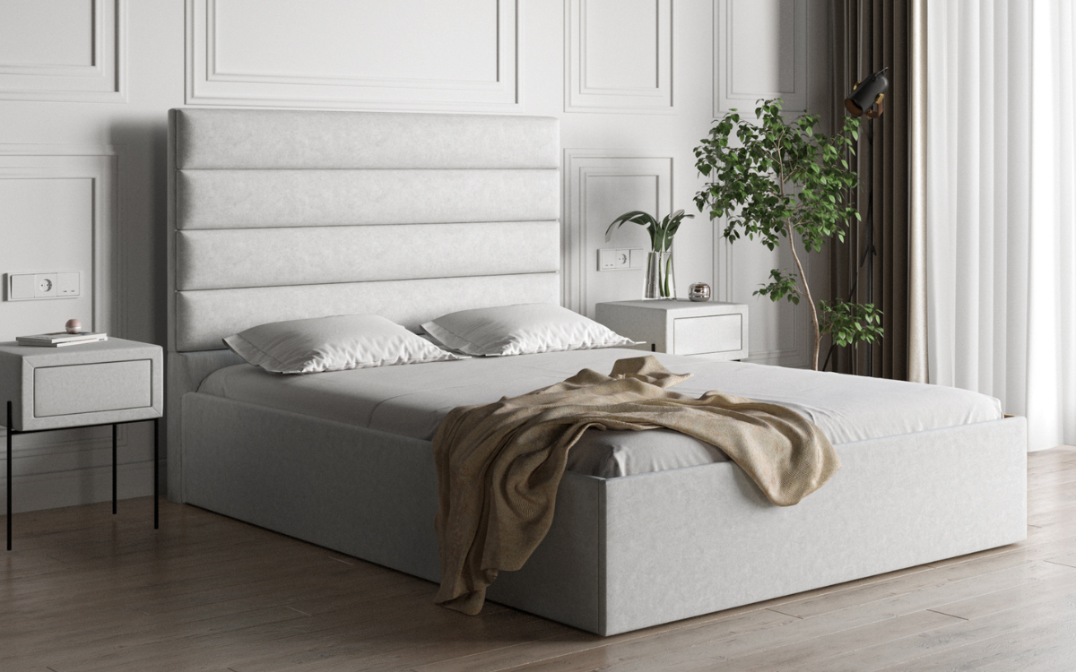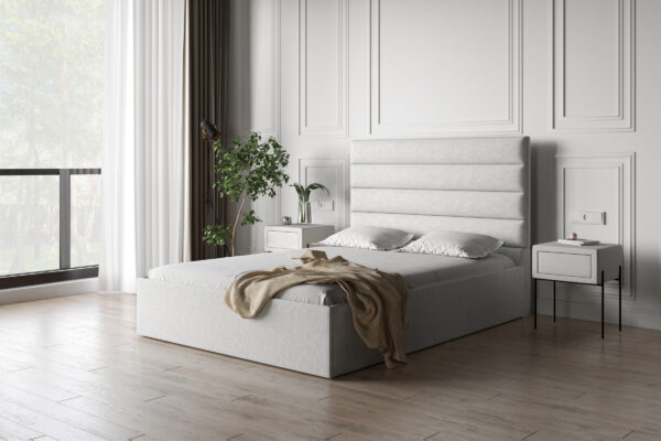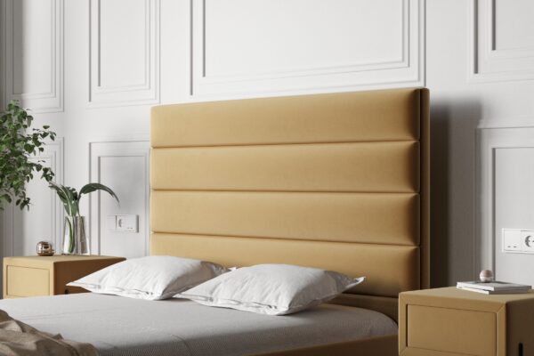 Linia Replace&Reuse to nowoczesne spojrzenie na sypialnię z tapicerowanym łóżkiem i pięknym, eleganckim zagłówkiem. Poziome przeszycia sprawiają bardzo eleganckie wrażenie, a sam zagłówek pomoże wprowadzić do sypialni spokój i harmonię. Łóżka tapicerowane mają wdzięk i podnoszą walory estetyczne każdego wnętrza. Nie inaczej jest z tym zagłówkiem, którego ciekawe poziome przeszycia będą się świetnie komponować z wyglądem nowoczesnej sypialni. Zagłówek jest bardzo prosty w montażu oraz demontażu. Tym, co wyróżnia go na tle innych elementów tapicerowanych jest fakt, że wezgłowie można zdjąć i wymienić na inne, dzięki czemu można niewielkim kosztem i wysiłkiem odświeżyć lub zmienić wygląd sypialni. Zagłówek składa się z elementów tapicerowanych na rzepach. Zagłówek ma wysokość około 130 cm i grubość około 12 cm.