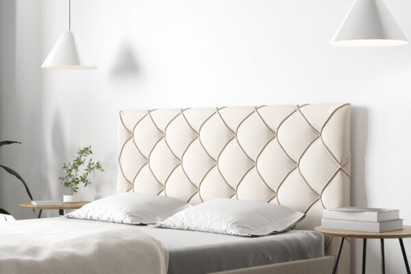 Elegancki, bogato zdobiony skośnymi przeszyciami zagłówek. Idealnie komponuje się z każdym korpusem serii Multisystem i otwiera nieograniczone możliwości stworzenia własnego projektu łóżka. Bogactwo tkanin pozwala zaaranżować sypialnię według indywidualnych upodobań i profesjonalnie połączyć wezgłowie z korpusem. Wykonany jest z płyty obitej owatą i tkaniną meblową. Zagłówek ma wysokość około 104 cm i grubość około 11 cm. Za dopłatą istnieje możliwość zamówienia zagłówka o wysokości lub szerokości innej niż standardowa oraz otapicerowania go w tylnej części.