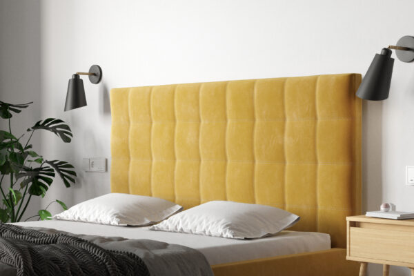 Geometryczny, gęsto przeszywany poziomo i pionowo ściegiem dwuigłowym zagłówek. Idealnie komponuje się z każdym korpusem serii Multisystem i otwiera nieograniczone możliwości stworzenia własnego projektu łóżka. Bogactwo tkanin pozwala zaaranżować sypialnię według indywidualnych upodobań i profesjonalnie połączyć wezgłowie z korpusem. Wykonany jest z płyty obitej owatą i tkaniną meblową. Zagłówek ma wysokość około 116 cm i grubość około 8 cm. Za dopłatą istnieje możliwość zamówienia zagłówka o wysokości lub szerokości innej niż standardowa oraz otapicerowania go w tylnej części.