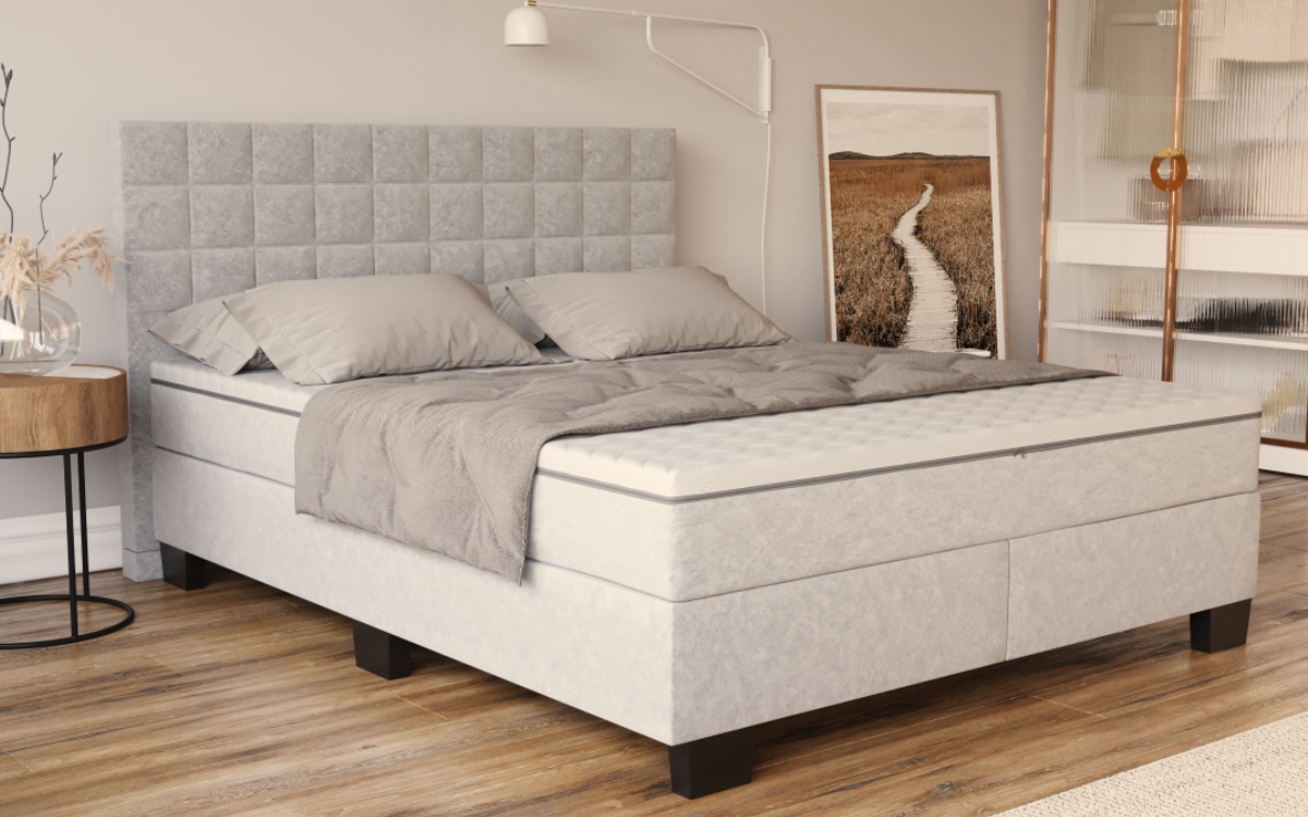 Ten minimalistyczny box składa się z korpusu łóżka z nogami i zagłówka. To klasyczne łóżko kontynentalne w obiciu z tkaniny w bogatej kolorystyce, na ramie z płyty i na stelażu z listew prostych. Możliwość zestawienia z materacem i przekładką w adekwatnej tkaninie. Łóżko charakteryzuje geometryczne wezgłowie. Znakomicie się prezentuje w nowoczesnych, subtelnych sypialniach. Istnieje możliwość różnego kompletowania zestawów kontynentalnych z wykorzystaniem boxów, materacy do łóżek box oraz przekładek Orchila WIN.