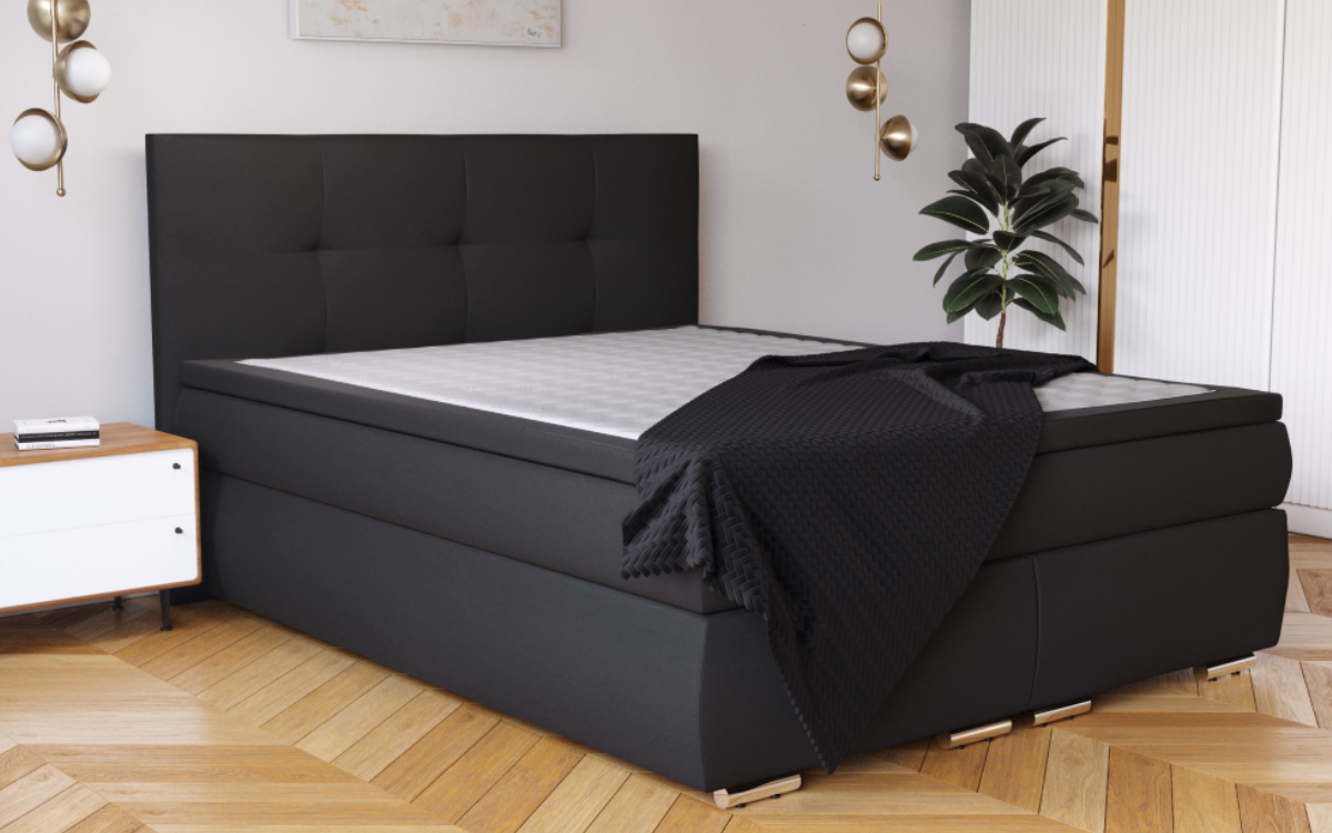 Box składa się z korpusu łóżka z nogami i zagłówka. To klasyczne, komfortowe łóżko kontynentalne w obiciu z tkaniny w bogatej kolorystyce, na ramie drewnianej, posiadające wkład ze sprężyn bonelowych. Możliwość zestawienia z materacem i przekładką w adekwatnej tkaninie. Łóżko znakomicie się prezentuje w każdym typie sypialni.