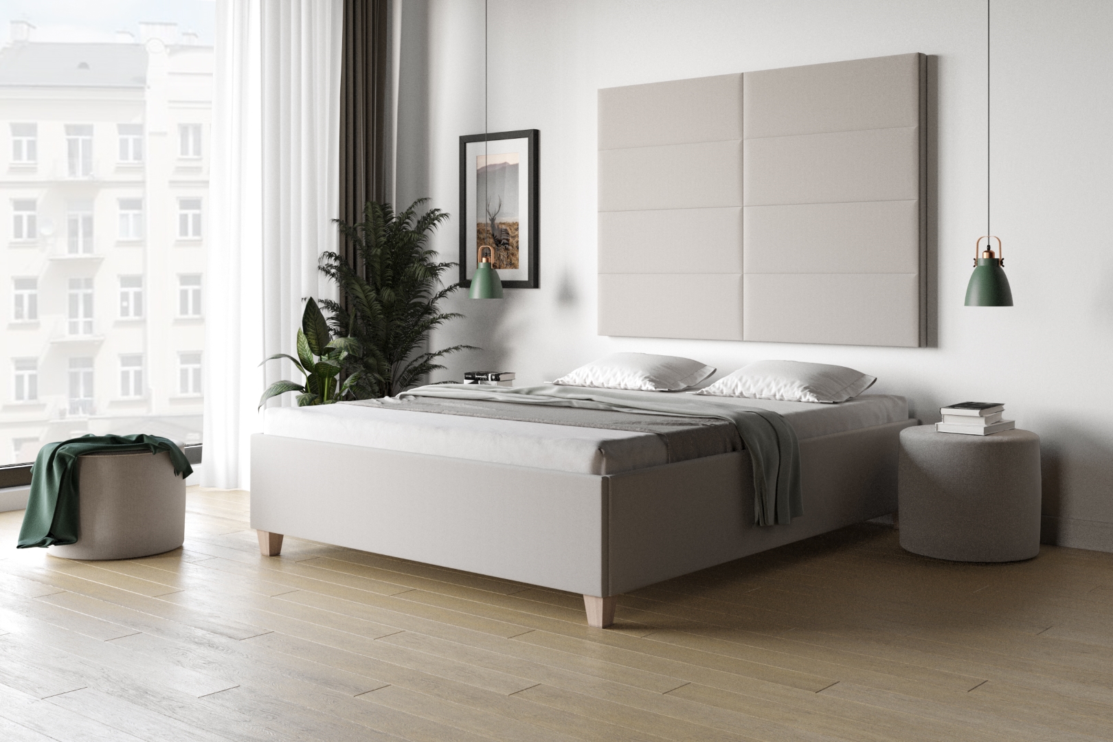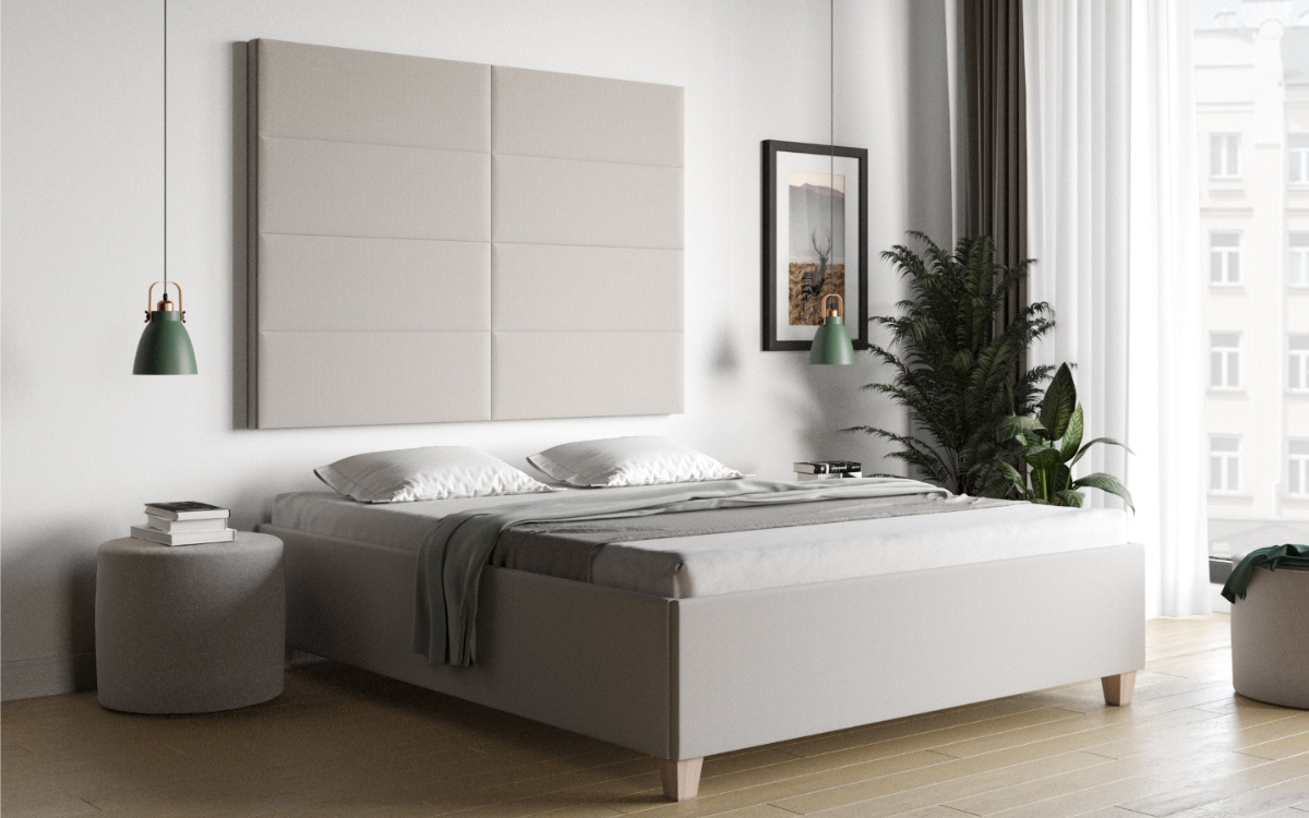 Wysoki zagłówek w sypialni to coś, co zdecydowanie przyciąga zaintrygowane spojrzenia. Zwłaszcza że zagłówek widoczny na zdjęciu to tak naprawdę panel tapicerowany. Wyróżnia go to, że jest montowany bezpośrednio do ściany, a nie jak zazwyczaj do ramy łóżka. Dzięki temu zyskuje zupełnie oryginalny i dość intrygujący wygląd. Ponadto jest to wysoki panel, ma aż 120 cm wysokości, dlatego świetnie sprawdzi się zwłaszcza we wnętrzach z wysokimi sufitami czy w industrialnym lofcie. Panel jest dostępny w wielu kolorach i tkaninach obicia do wyboru. Pasuje idealnie do nowoczesnego łóżka tapicerowanego o modnym wyglądzie. Samodzielnie zdecyduj, czy wolisz panel w kolorze pasującym do łóżka, czy może wprost odwrotnie – chcesz stworzyć delikatnie prowokujący klimat z kontrastowym panelem za łóżkiem. Bez względu na to, co wybierzesz, ten panel i tak przyciągnie pożądliwe spojrzenia twoich gości. Ma symetryczną budowę, dzięki czemu buduje w sypialni poczucie harmonii i spokoju.